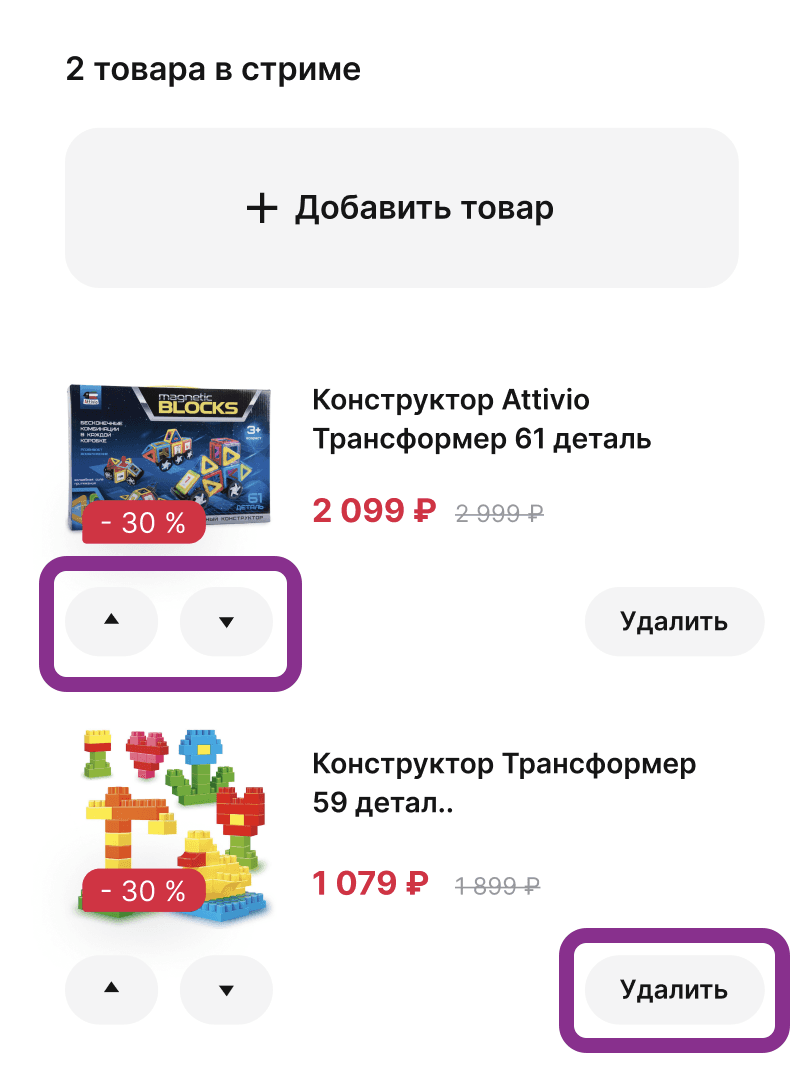 Во время стрима товары будут расположены в том порядке, в котором они добавлены. Чтобы изменить порядок товаров, нажмите на стрелочки.