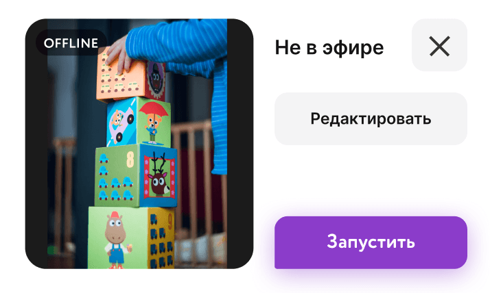 Когда будете готовы выйти в эфир, нажмите «Запустить». Статус на видео сменится на «live». Вы в эфире, удачи!