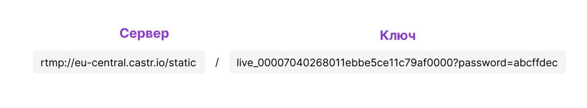 rtmp://eu-central.castr.io/static/live_00007040268011ebbe5ce11c79af0000?password=abcffdecОна состоит из двух частей: сервер трансляции и ключ трансляции. Всё, что находится до последней косой черты / — это сервер. Всё, что после — ключ. Если вы будете запускать стрим с компьютера, разделите ссылку на две части — это понадобится для запуска.