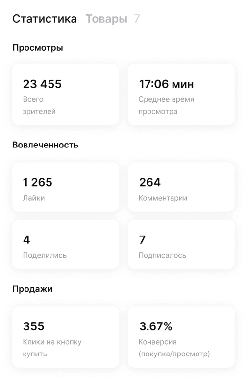 Статистика будет доступна через час после завершения стрима в вашем личном кабинете на сайте ShopStory. Она обновляется постоянно, пока хранится стрим.